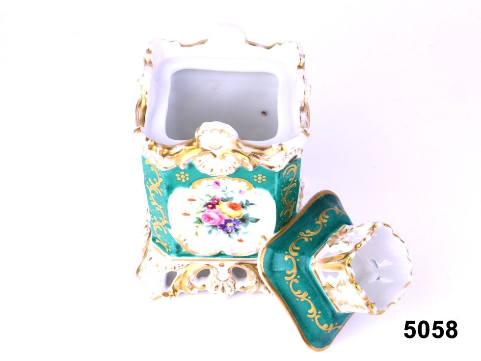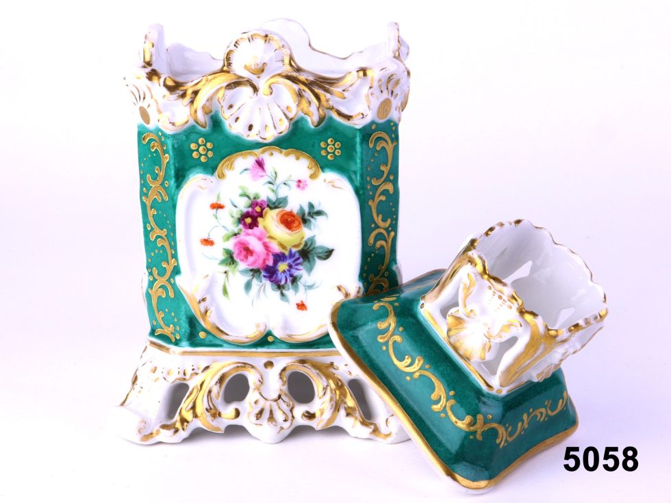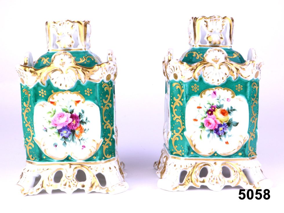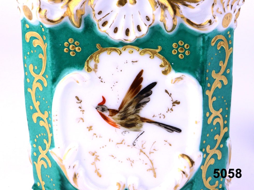 Matching pair of antique 19th century Paris porcelain pot pourri vases hand decorated with birds and flowers and gilt (Some gilt wear)