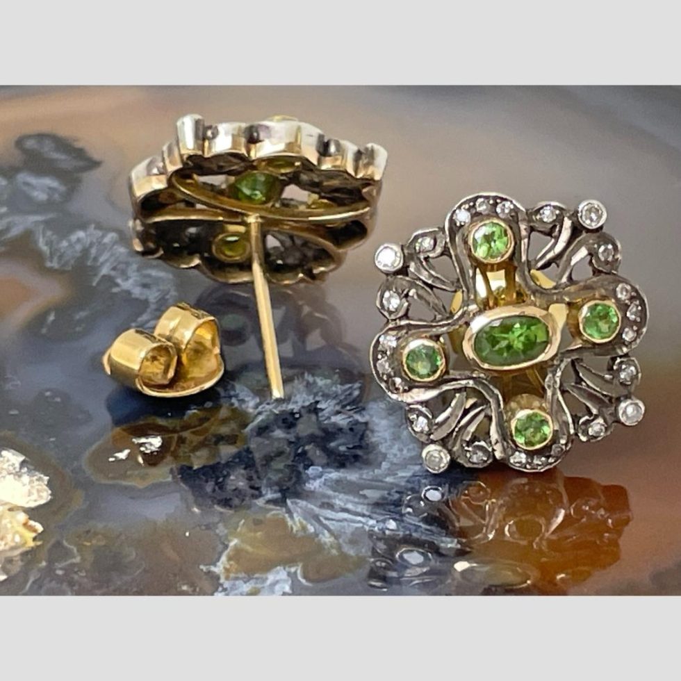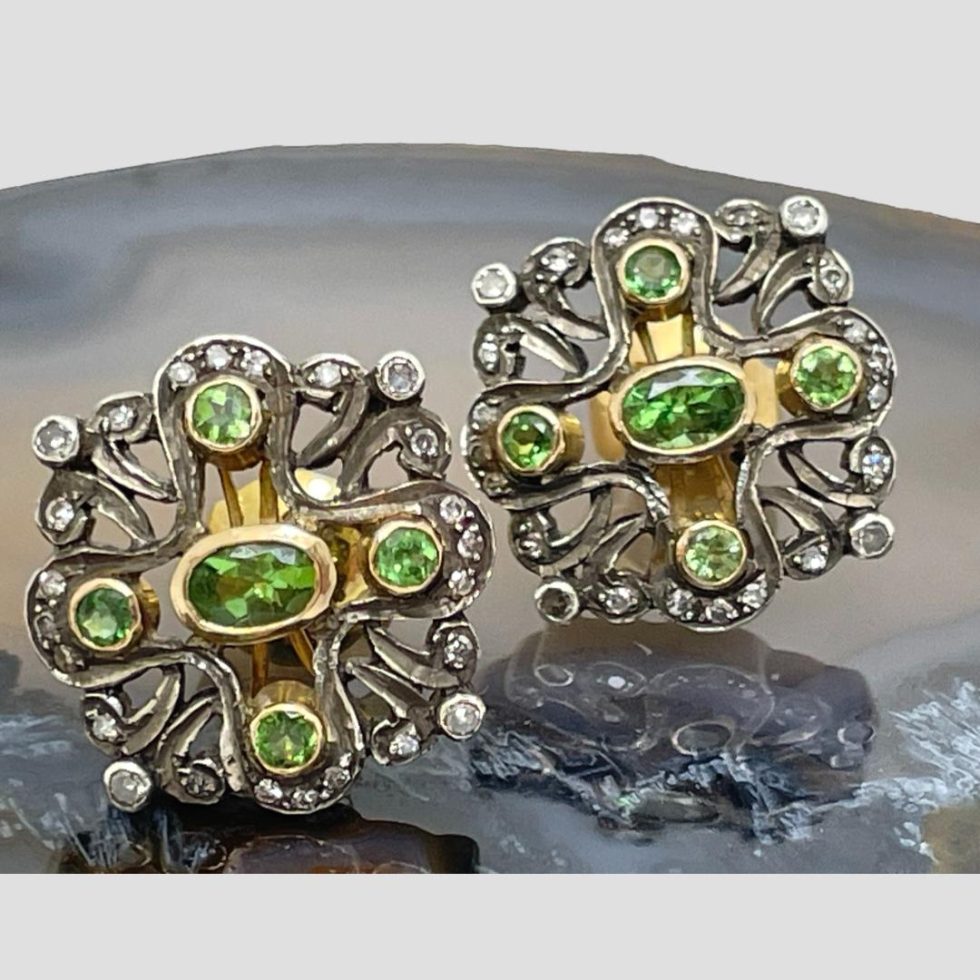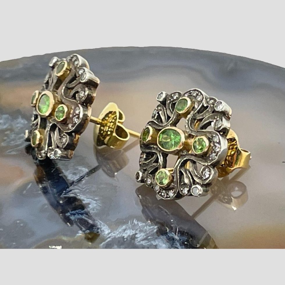 Modern peridot and diamond stud earrings. A unique pair of stunning modern stud earrings set with peridots and diamonds on unmarked gold & silver. A one off design and unique to Antiques of Kingston. Measures 15mm square at front.