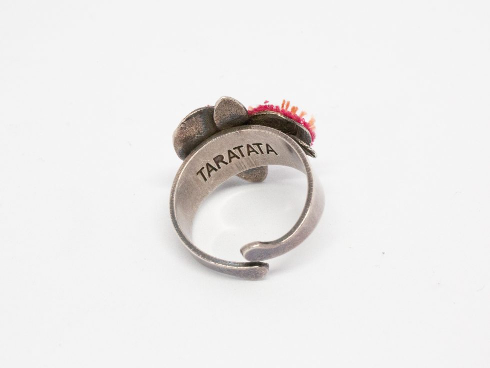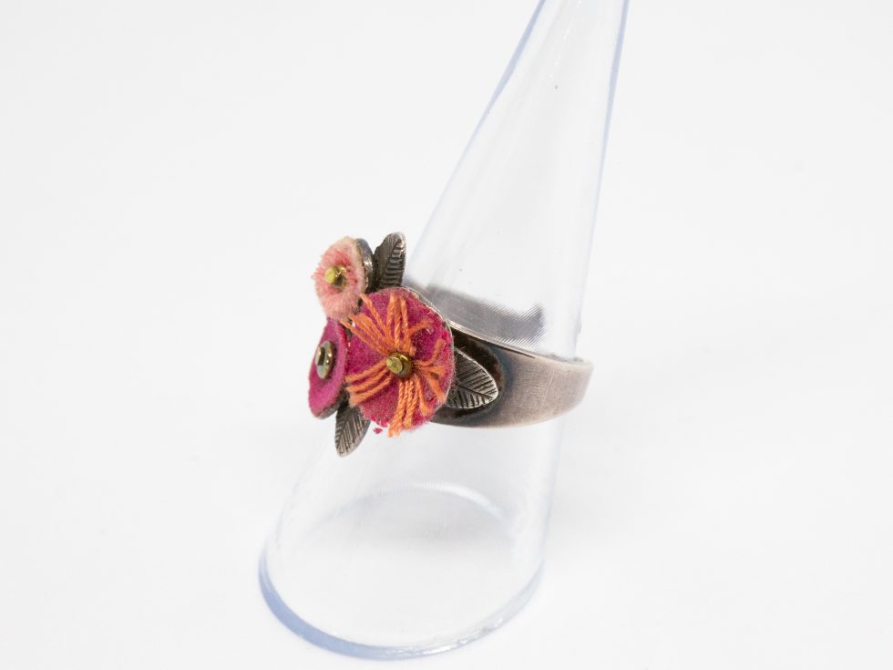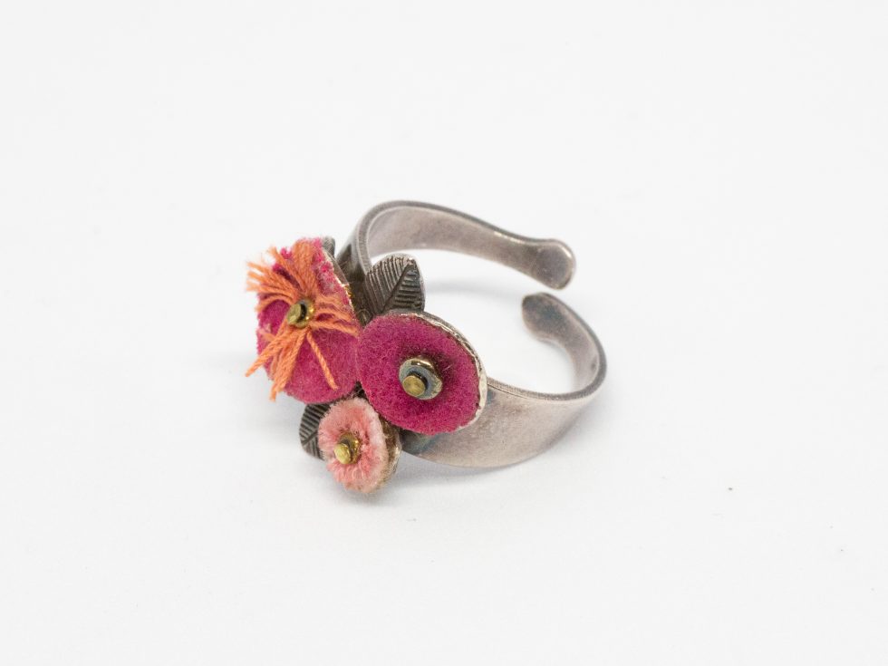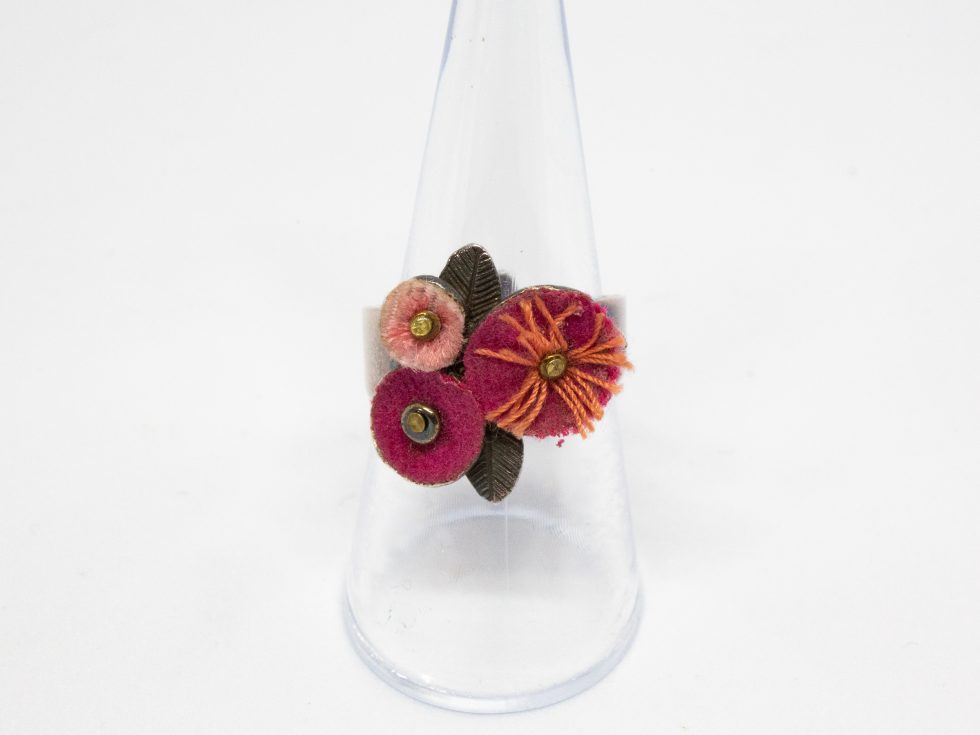 The pink flowers costume jewellery ring is the work of Taratata of France and will fit up to ring size ‘P’. The silver metal ring has an array of felt pink flowers on its top making this a pretty little item that displays well on the hand. To care for the pink flowers costume jewellery ring gently dust it with a soft cloth if necessary.