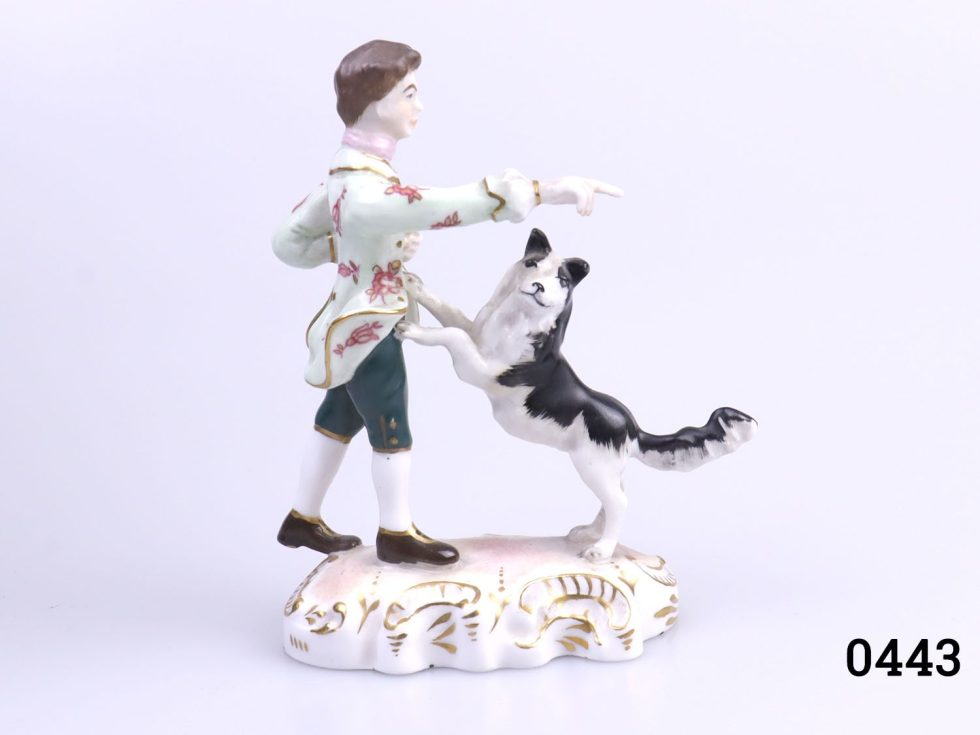 The Royal Crown Derby ‘The Shepherd’ by Edward Drew is a lovely example of a quality ornament from the Royal Crown Derby factory. The figurine features a boy standing in a Georgian dress with a staff in his hand, instructing the border collie dog to go forward but the dog wants to play. The delightful figurine would display well on a shelf where it can be a source of amusement to the viewer. To care for the Royal Crown Derby ‘The Shepherd’, we suggest light dust over with a soft cloth occasionally.
