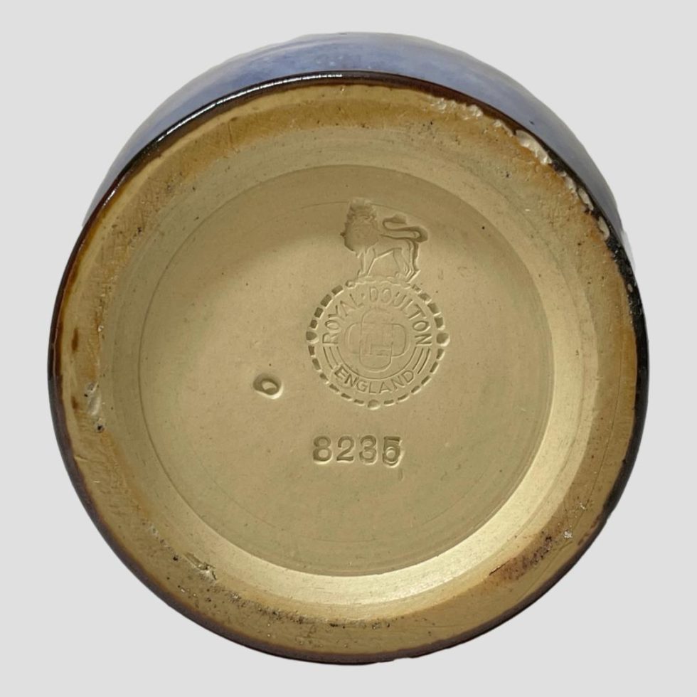 Tall Royal Doulton vase from the Art Deco era. A nice and tall Royal Doulton stoneware vase unsigned but attributed to Lily Partington c1922-23. Stamp on base bears the rarely used Doulton mark without the crown below the lion. In good condition throughout with just a few minor chips at the base rim. Measures 65mm in diameter at base, 95mm at widest and 80mm across the top. Collect from store only.