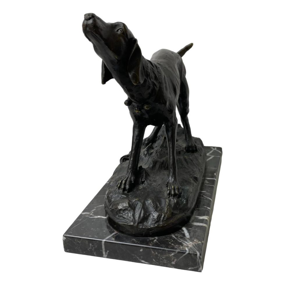 The signed bronze dog is an adorable representation of a dog ready to receive a command from its master, set on a black marble base.