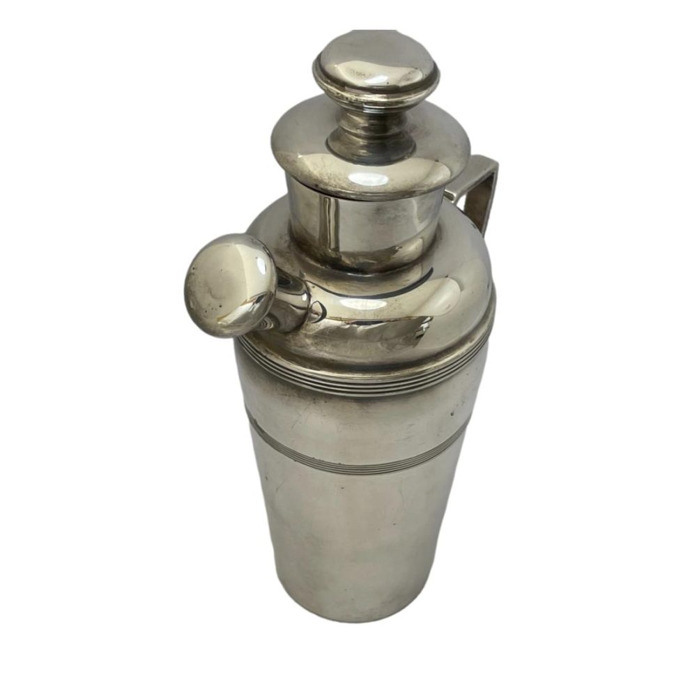 Silver plate cocktail shaker. Small silver plate cocktail shaker with pouring spout. All original lid and spout cover. In fair condition for its age with some signs of wear to the silver plate. Recommend cleaning before use.