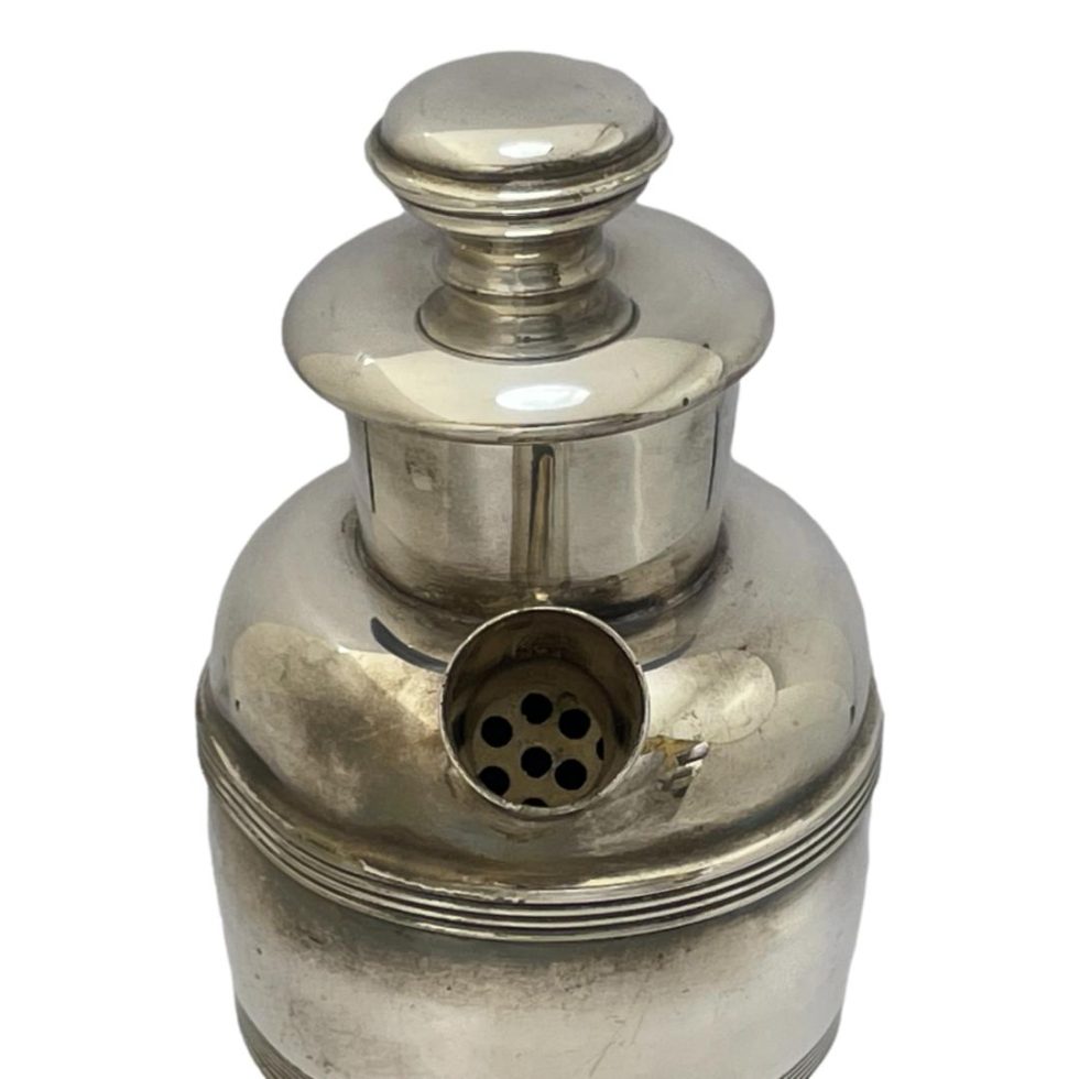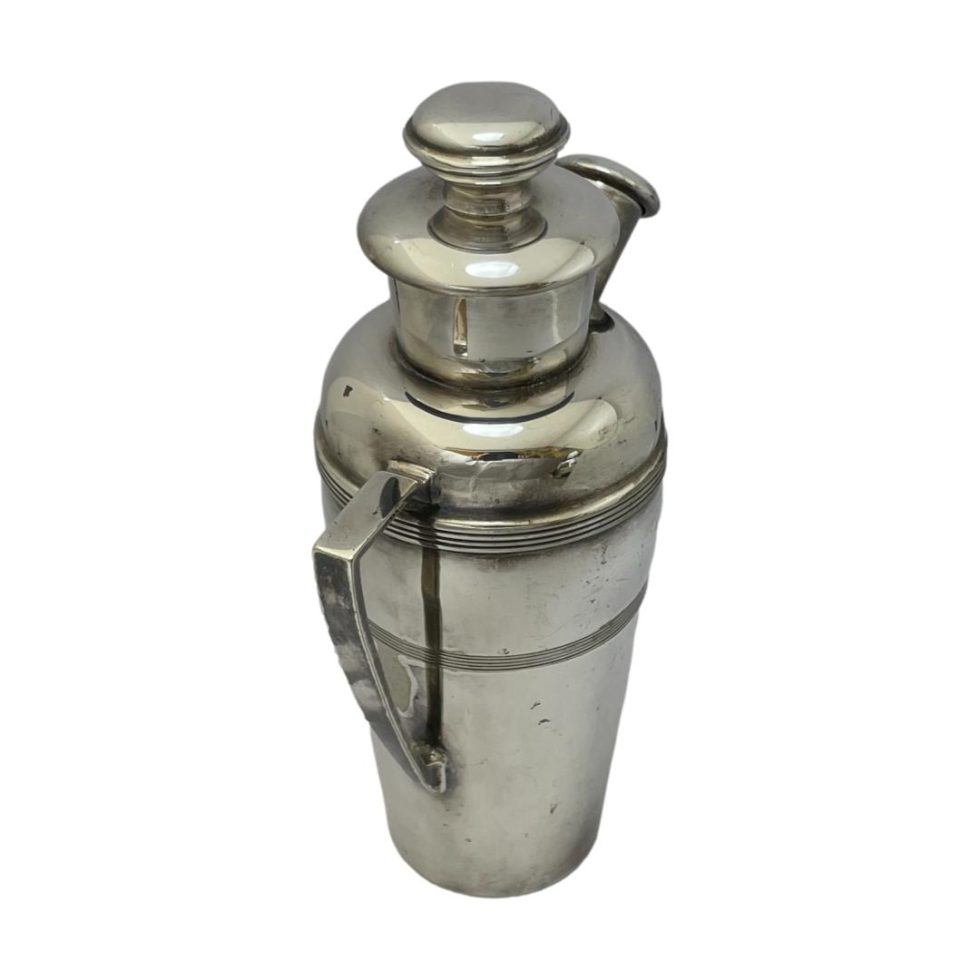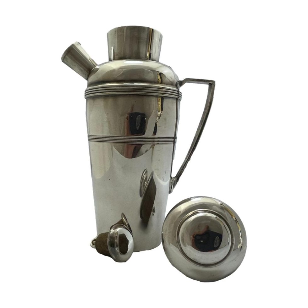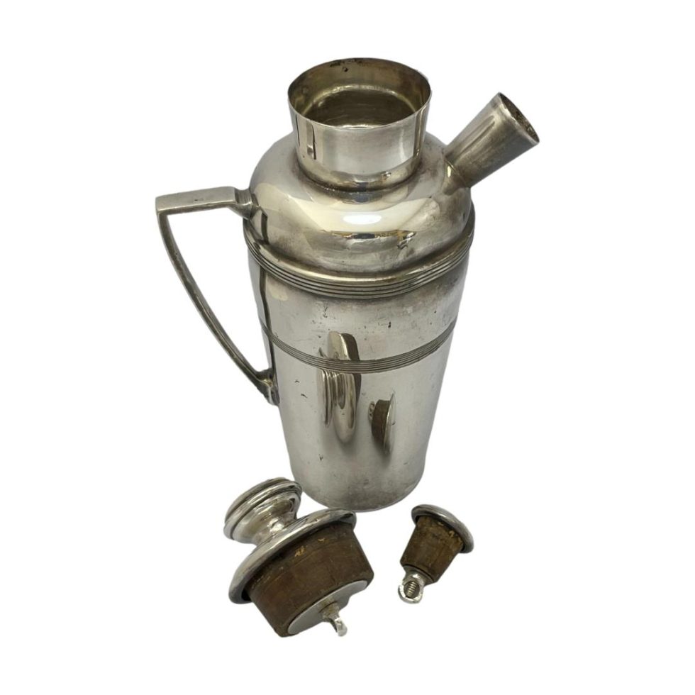 The silver plate cocktail shaker features a pouring spout and original lid and spout cover.