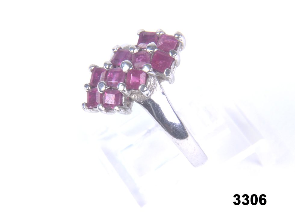 The silver ring set with ten rubies is in 925-grade silver and has a three-tier design of rubies creating an unusual display that looks well on the hand and would enhance most outfits in your wardrobe. The silver ring set with ten rubies will fit a finger size of 7.5 and would require minimal maintenance other than a gentle polish with a lint-free cloth when required.
