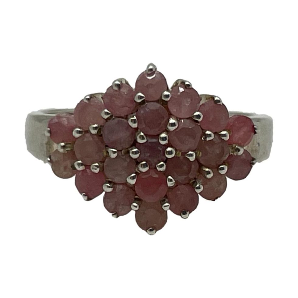 Sterling silver ruby cluster ring. Pretty pink ruby cluster ring set on sterling silver. Total of 23 small round cut pink rubies are set in a diamond shape and each stone separated with silver rod dividers. Ring size O.5 / 7.25.