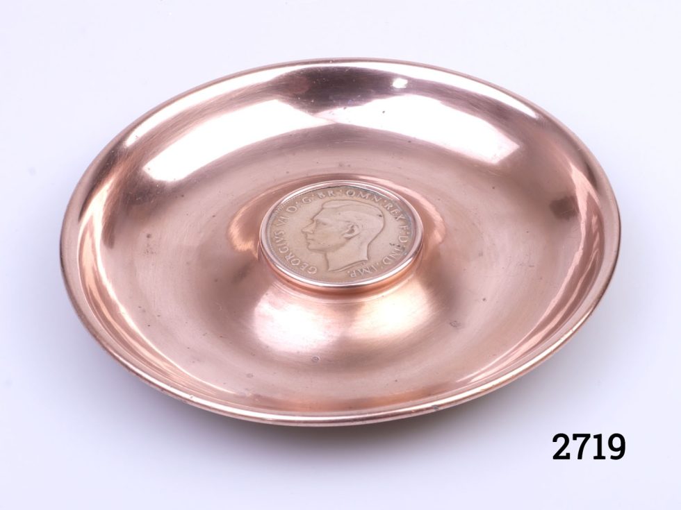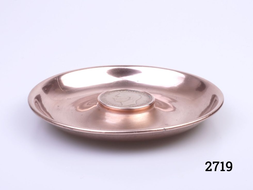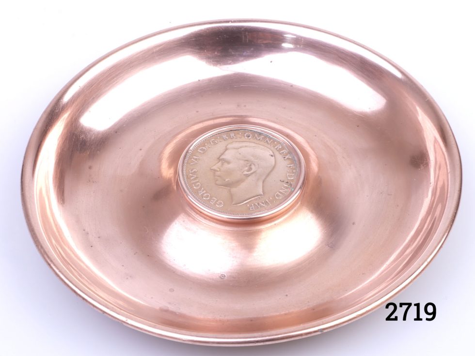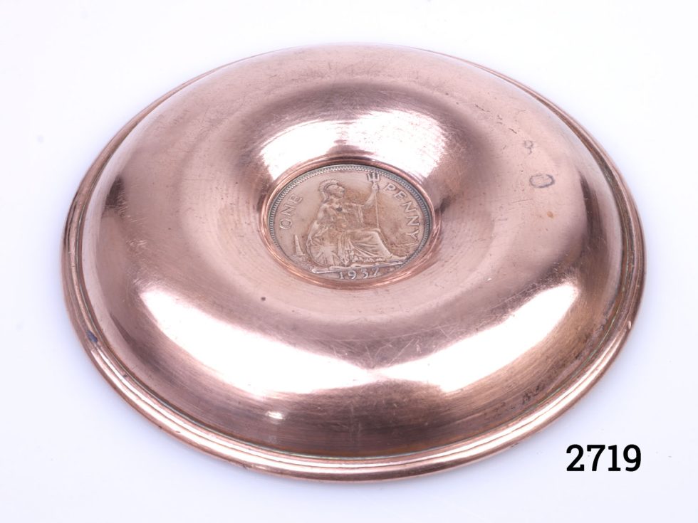 The small circular copper pin/coin tray is a highly collectable and interesting item. The copper pin tray features a 1937 old penny coin set in its centre on a slightly raised platform. This copper tray would display well on a desk in a study. To clean the small circular copper pin/coin tray gently dust with a soft dry cloth when necessary.