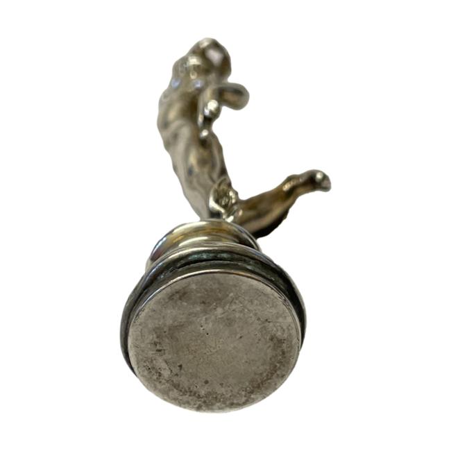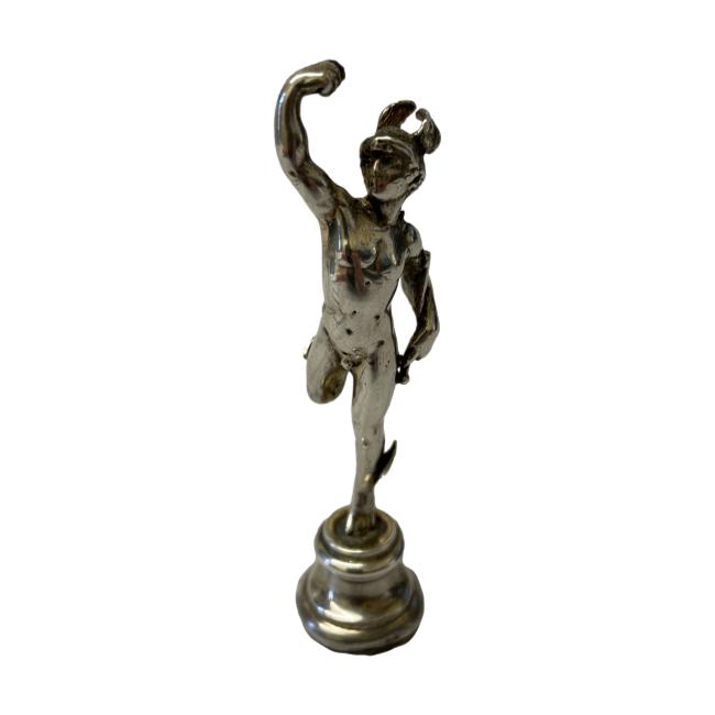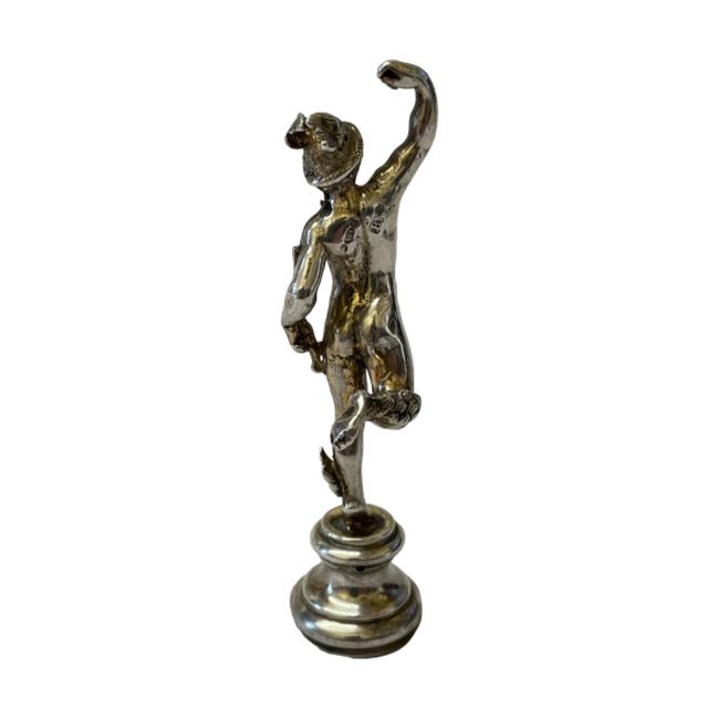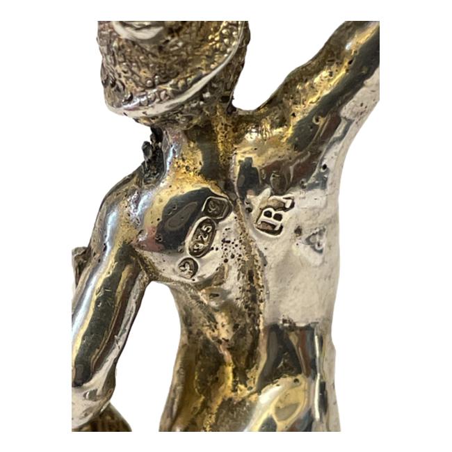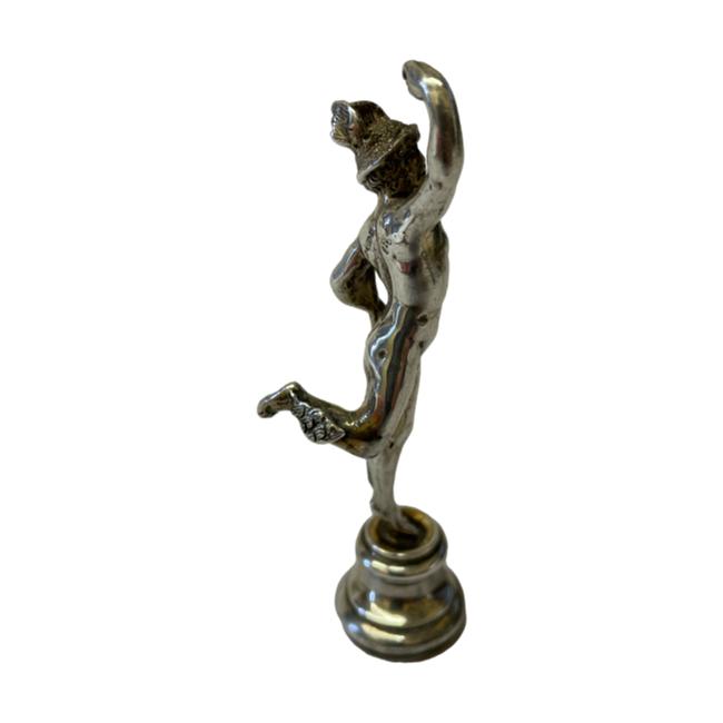 Small statue of Hermes in sterling silver. Very finely detailed small statue of Hermes in his most known pose. Top of his staff or caduceus (kērykeion) is unfortunately missing although this does not detract from the quality of the piece. Hallmark to the back is worn but dates for c1981. (Could also be used as a pipe tamper) Weight 40gms.