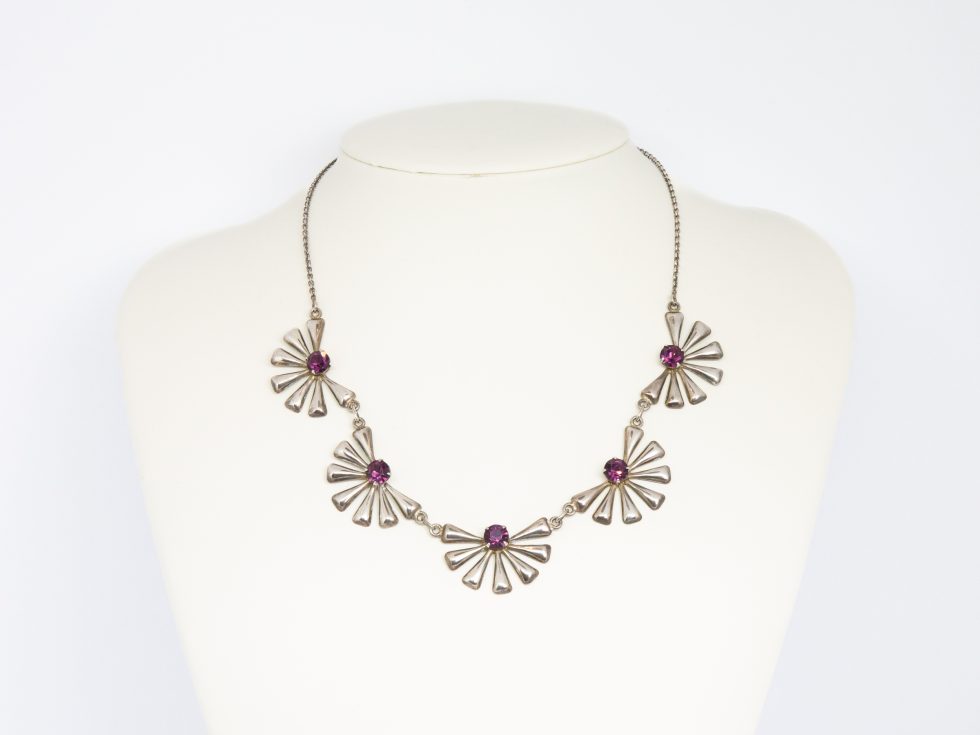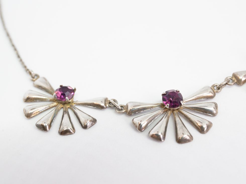 Sterling silver half daisy necklace. Pretty necklace in sterling silver with purple crystal stamen to each. Lovely accessory for summer! Hallmark to the back of central daisy. Made by K. Jeldahl of Denmark. Each daisy measures approximately 30mm wide by 20mm deep.