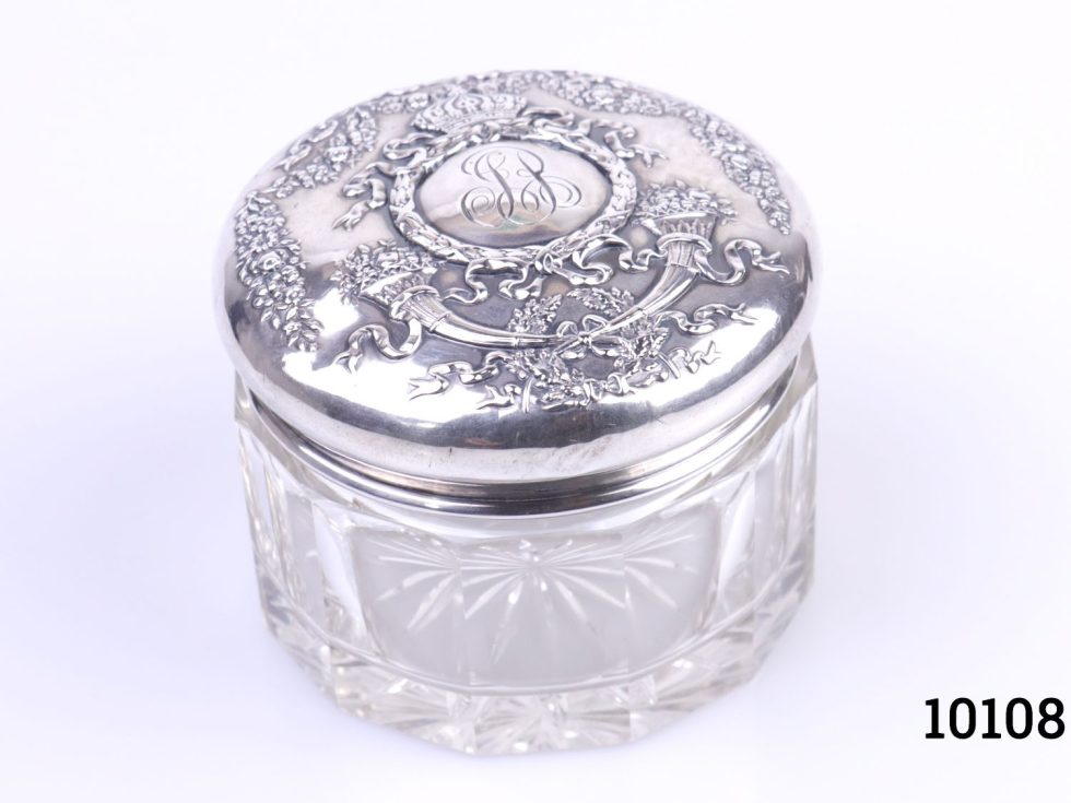 Sterling silver lidded glass pot. Vintage pot with heavily embossed silver lid. Personalised with initials JB