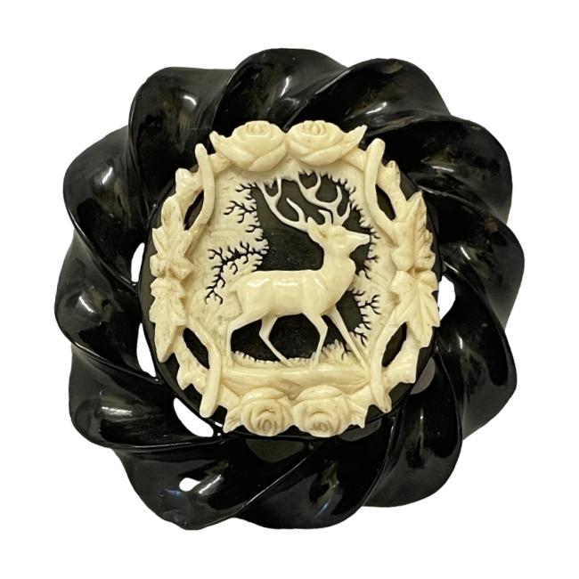 Victorian brooch in carved jet and bone. A substantial sized brooch of beautifully carved Whitby jet with an intricately carved bone detail of a stag applied to the centre. The stag is central to a frame of flora with a tree to the background. This is craftsmanship of the highest order and remains in excellent condition. Believed to be from the Grand Period of the Victorian era c1861-1880. Tube hinge and c clasp fastening with extended pin.