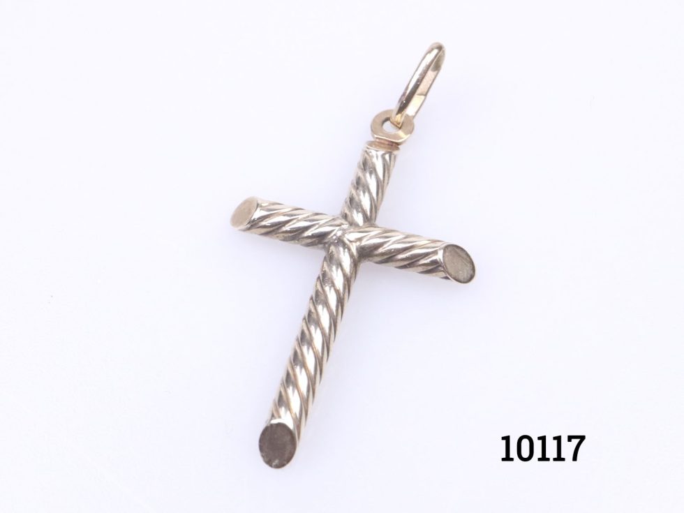 Vintage 9 karat gold cross in a rope twist design. Fully hallmarked to the bail for imported gold assay stamped in Sheffield and on the top of the cross. c1975-1998.