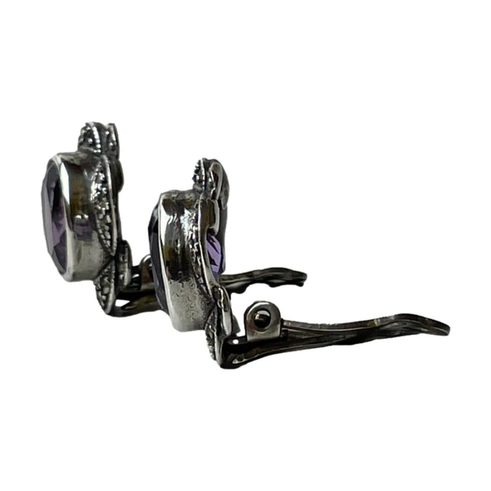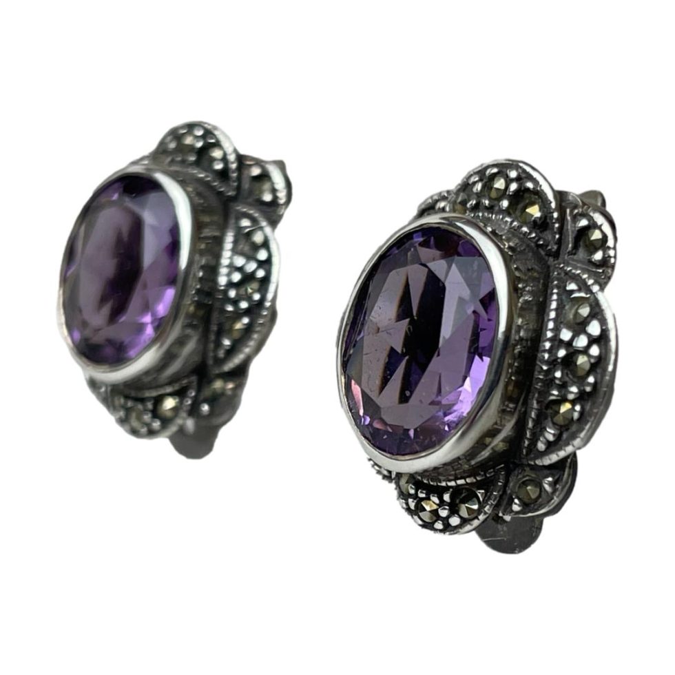 Vintage clip-on earrings with amethyst. Sterling silver clip-on earrings in an Art Deco style with a good sized oval cut amethyst stone to the centre with marcasite surround. Hallmarked 925 for sterling silver to the back. Both clips in good working order. Earrings measure 20mm long by 16mm wide. Amethyst measures 10mm by 8mm.
