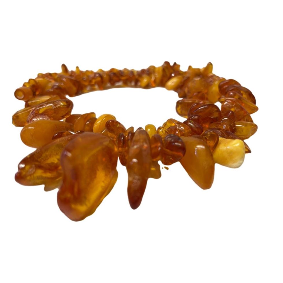 The vintage Baltic amber necklace features cognac amber, butterscotch, and egg yolk pieces forming a beautiful array of colours.