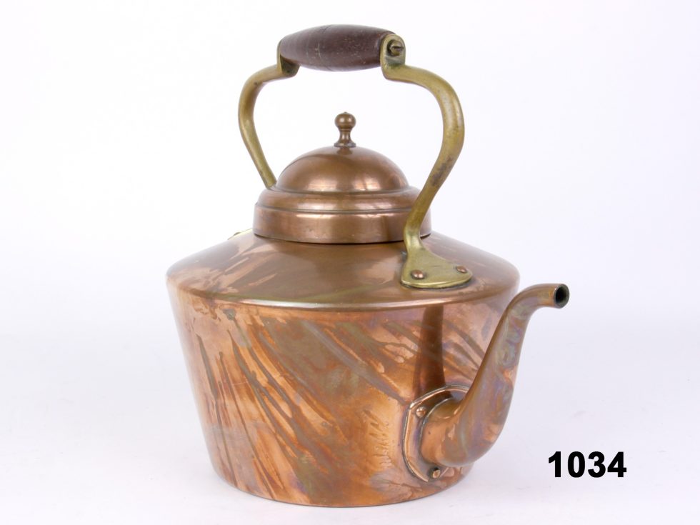 The vintage copper kettle is a decorative item and measures 240mm in height and would display well in a country-style kitchen. The kettle has a strong wooden handle which can be useful for hanging the kettle under a suitable shelf. To clean the vintage copper kettle use a copper cleaner preparation and a soft cloth and buff it to a shine.