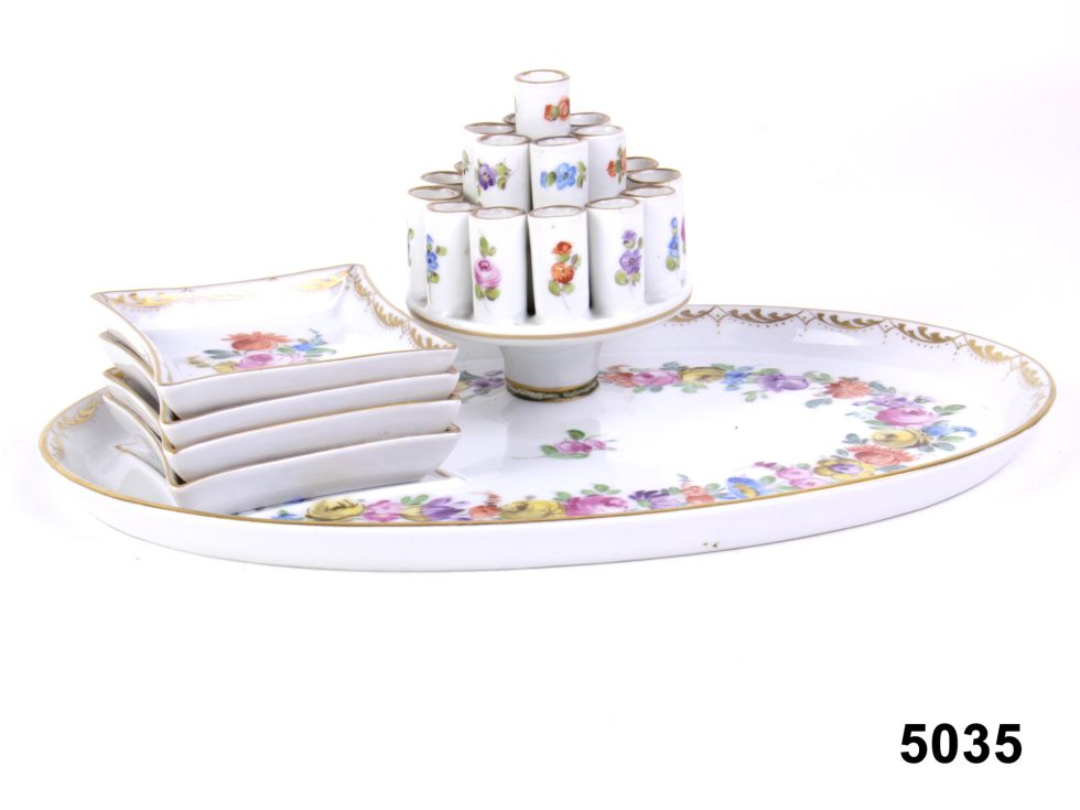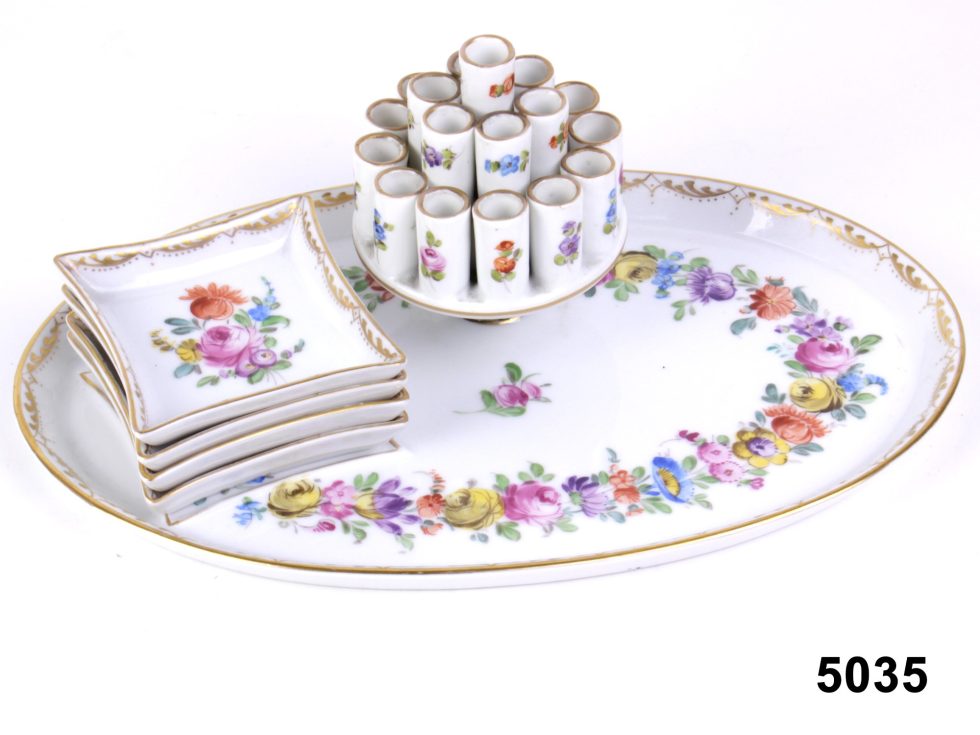 Dresden porcelain cigarette server with holder attached onto oval tray with 4 separate matching small ashtrays