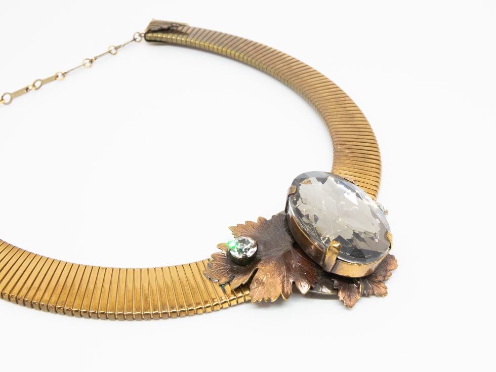 Vintage designer necklace by Ermani Bulatti. Striking design mix of Art Deco and Art Nouveau. Gilt metal choker style necklace with a bronzed leaf to the front set with a large acrylic smoky stone to the centre with Swarovski crystal to either side.
