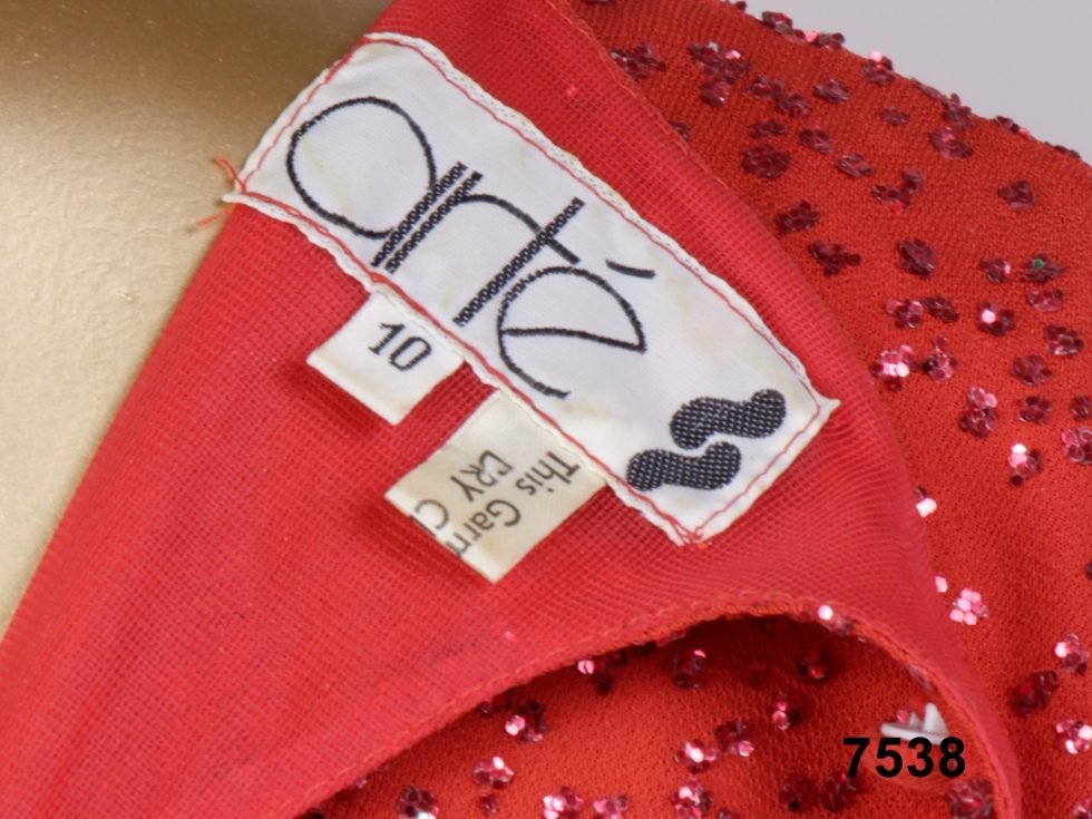 The red glitter dress is a vintage item of clothing in a UK size of 10/12 and features a full-length dress with long sleeves in a red glitter jersey silk material. The glamourous evening gown is in good condition and is wearable today and would look fabulous on a special evening event. The dress is figure-hugging and has padded shoulders in the true 80s style. To care for the red glitter dress, we suggest dry cleaning only due to the delicate fabric.