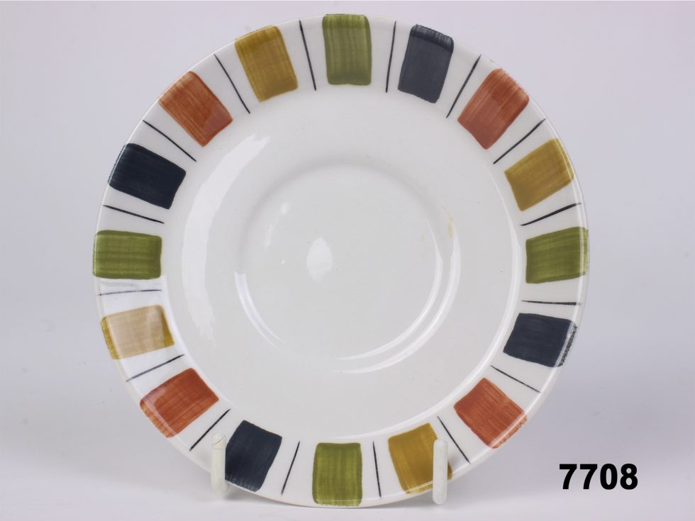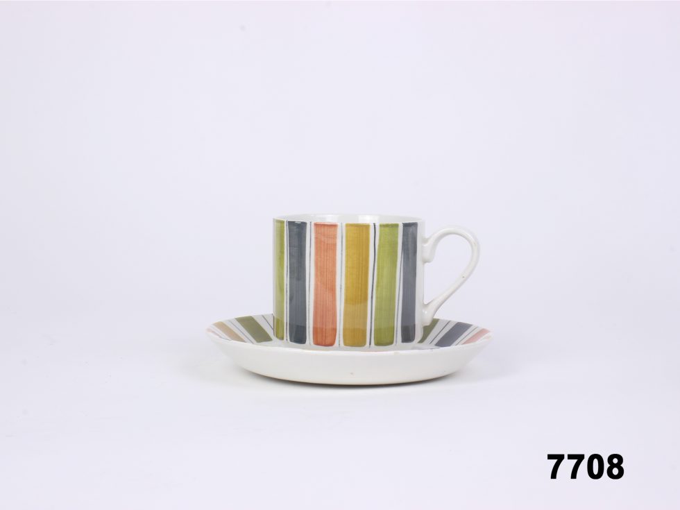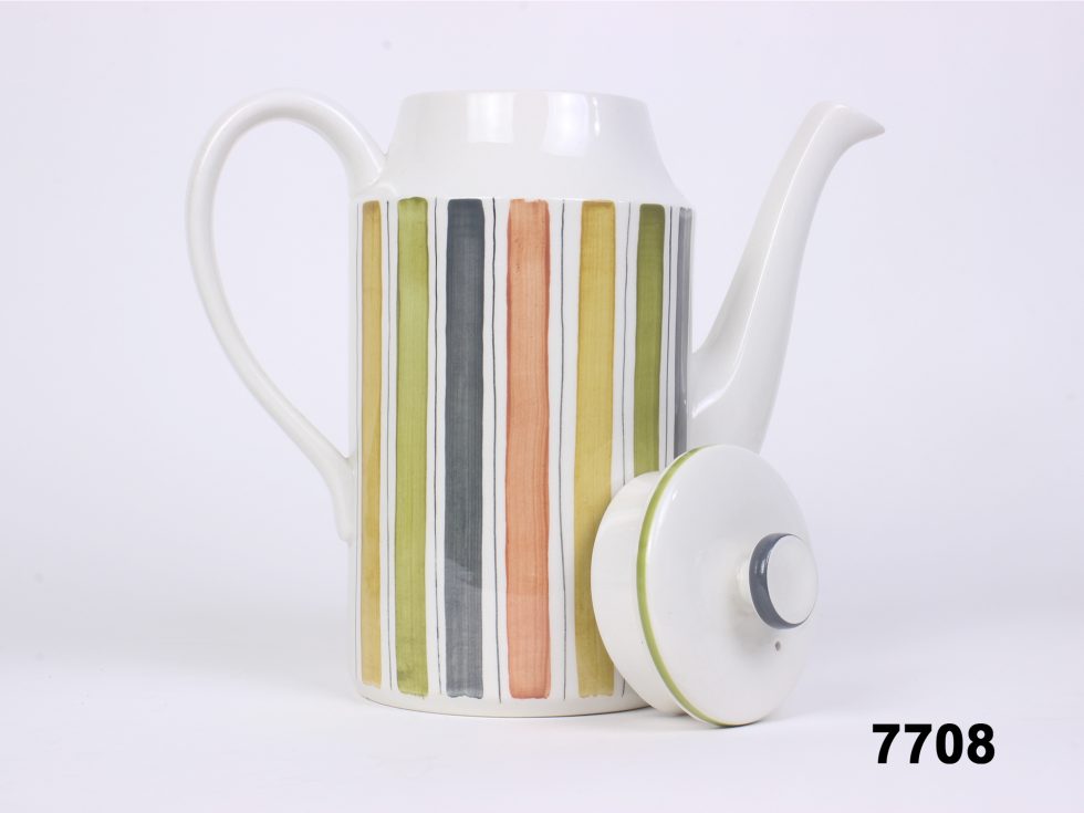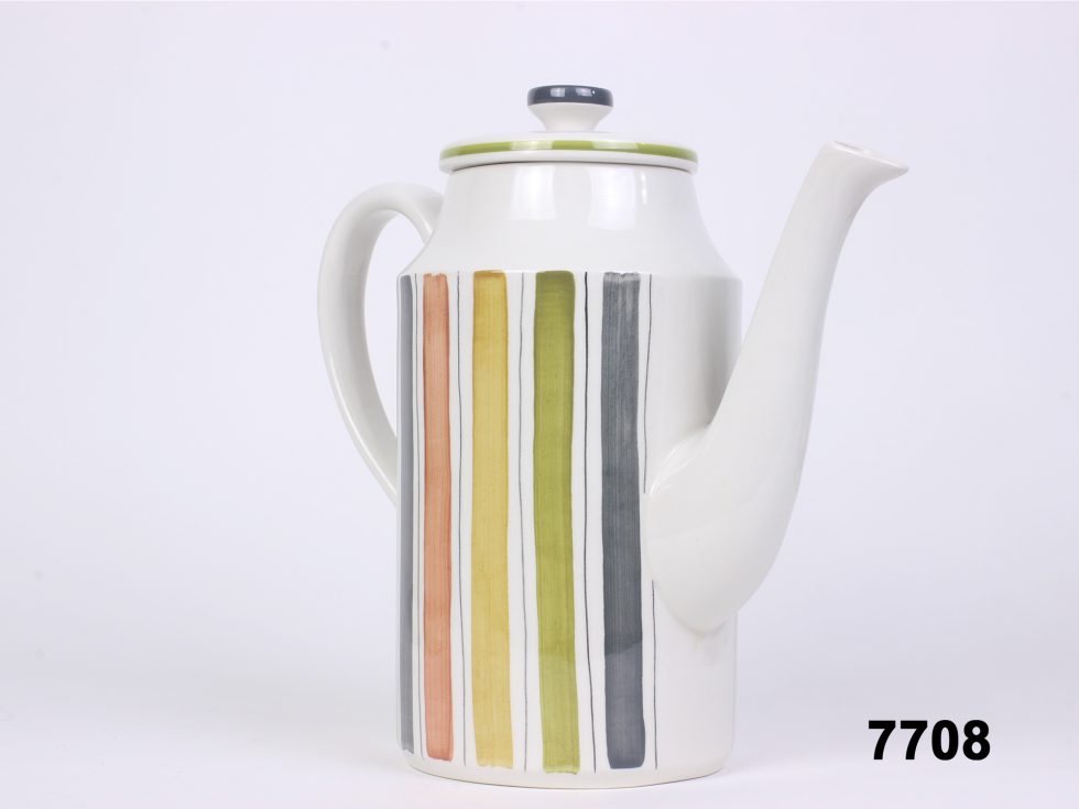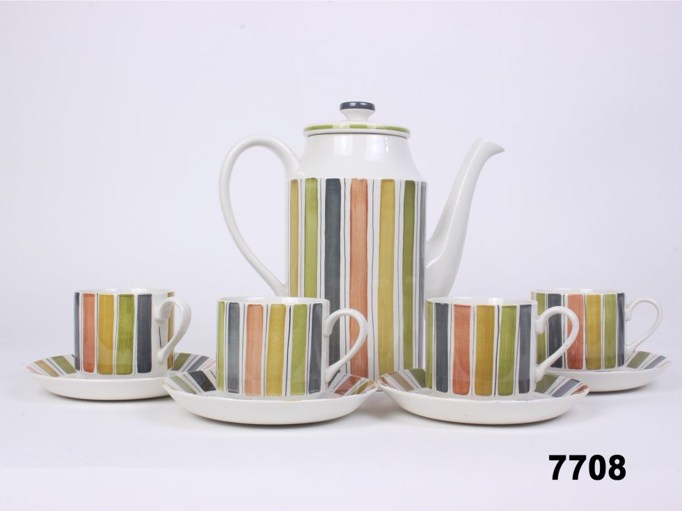 The vintage Midwinter ‘Mexicana’ coffee set has a retro design popular in the 1970s, featuring a coffee pot and four cups and saucers in stripes of muted autumn colours. The set would display well on a dining table, perfect for an after-dinner coffee. To care for the vintage Midwinter ‘Mexicana’ coffee set, we suggest a wash in soapy water and drying thoroughly after use.