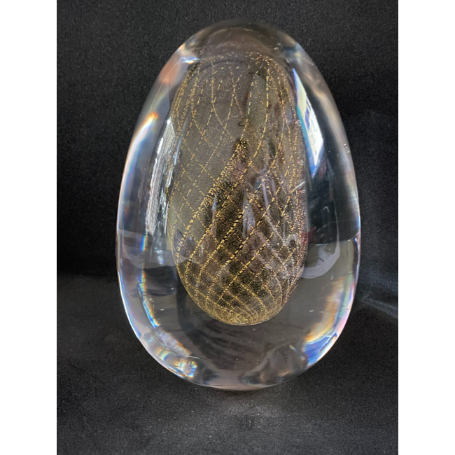 Vintage egg shaped paperweight by Murano. A clear glass mid sized egg shaped paperweight with an inner 3 dimensional image which is only clearly visible in a certain light and angle. The inside form is of purple/brown stripes to one area which are connected to almost invisible golden strands. A truly wonderful piece of art by the great Murano glass master Archimede Seguso. Signed to the base. Heavy item – collect from store only. Base measures 30mm in diameter.