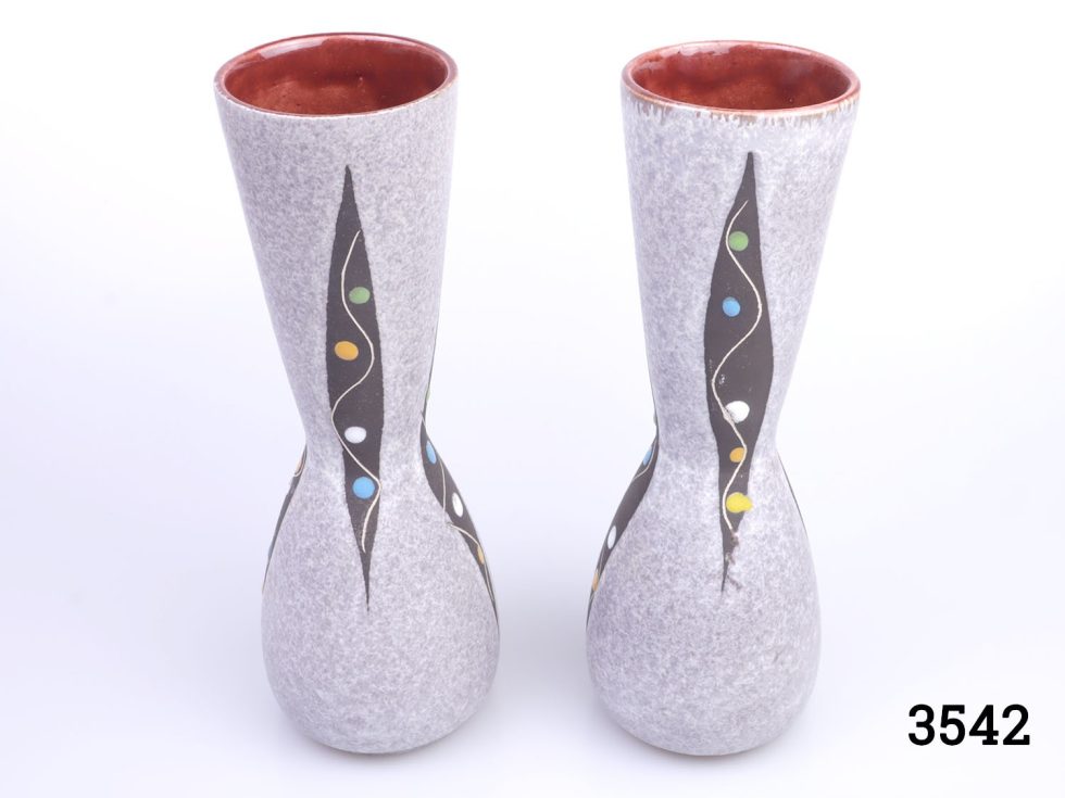 The pair of 50s West German vases have the iconic retro look of the 1950s era. The vases have a background colour of speckled grey with central panels featuring colourful dots on either side of the wavy line. The pair measure 205mm in height and would look good with cut flowers or just as a stand-alone ornament. To care for the pair of 50s West German Vases, we suggest using a soft cloth and dusting it over as required.