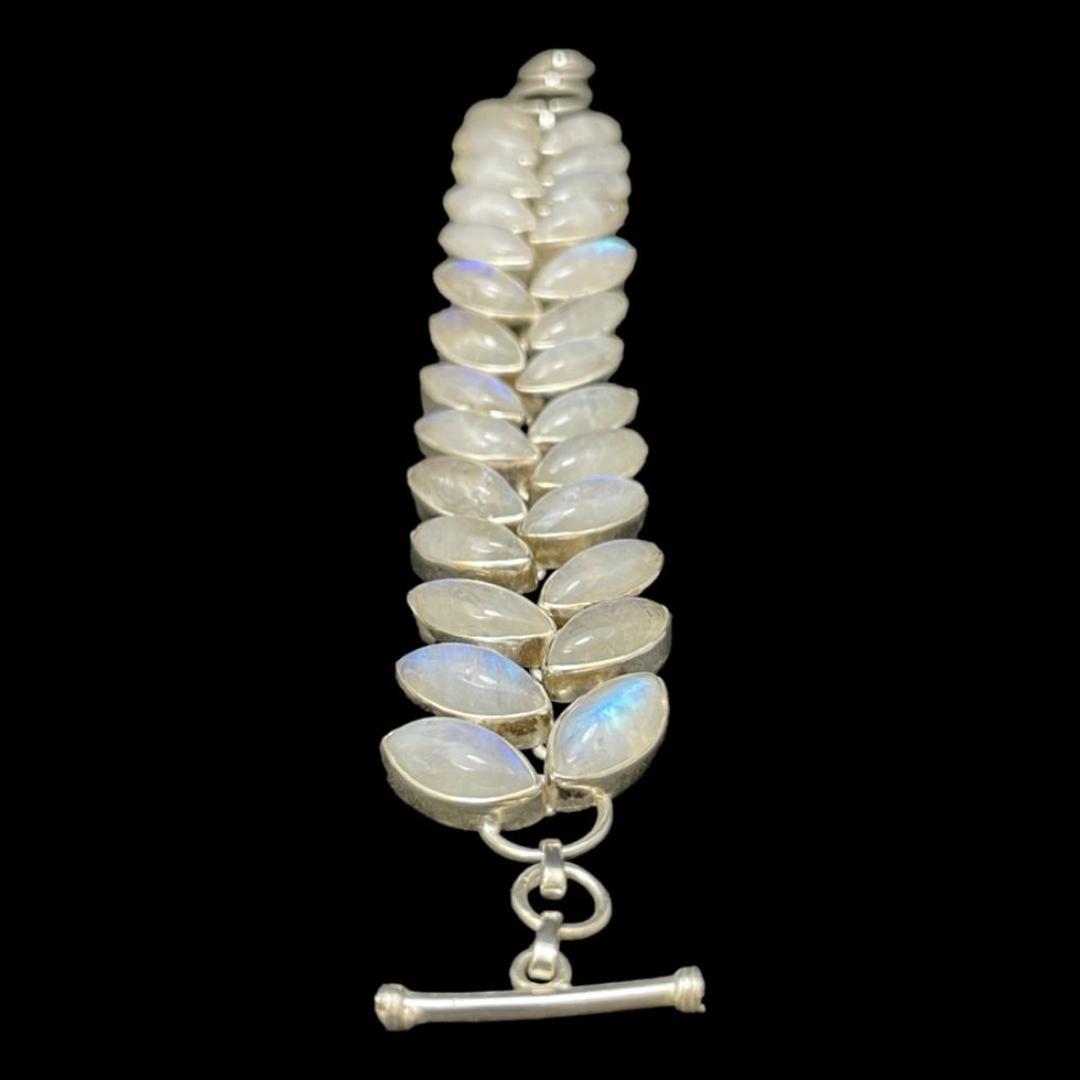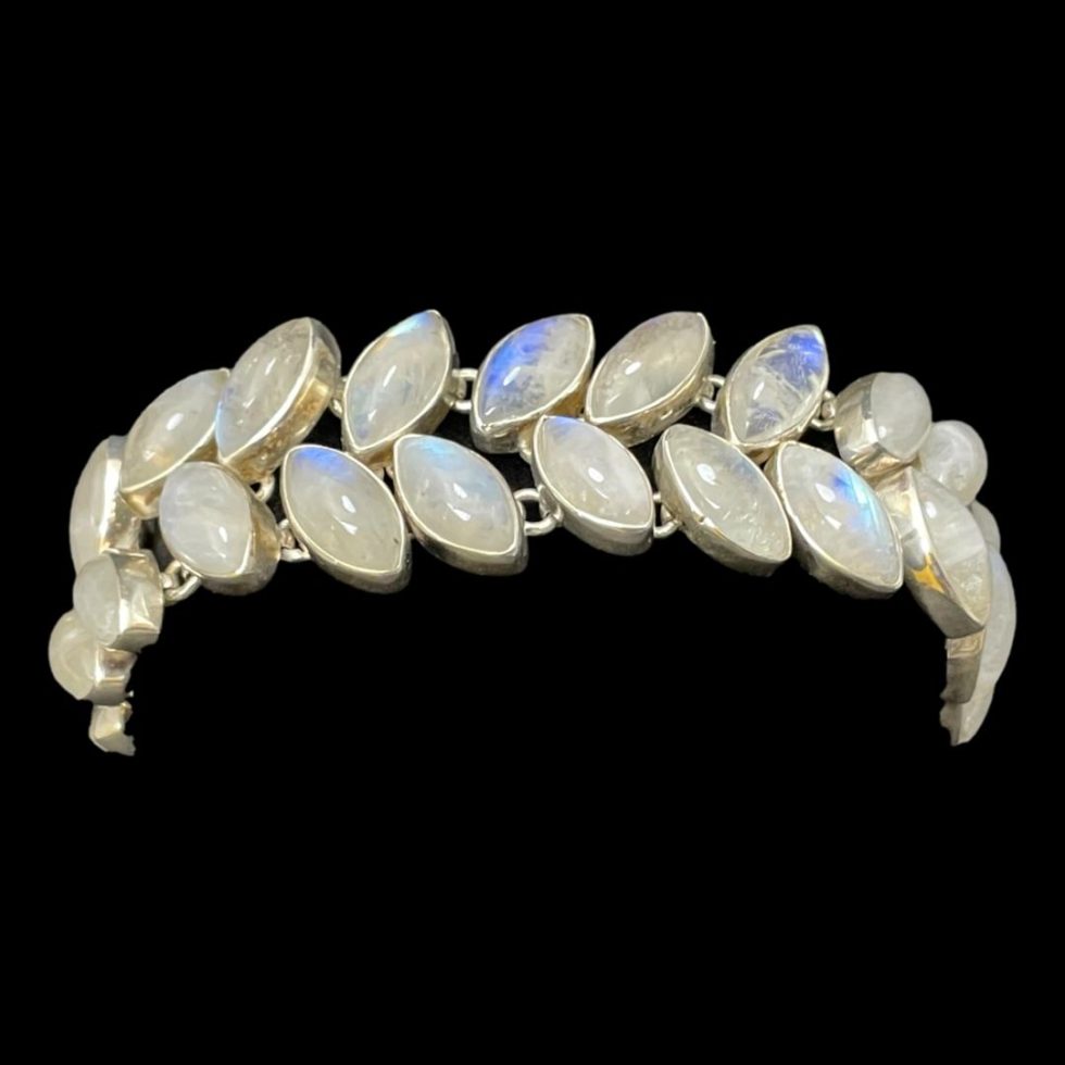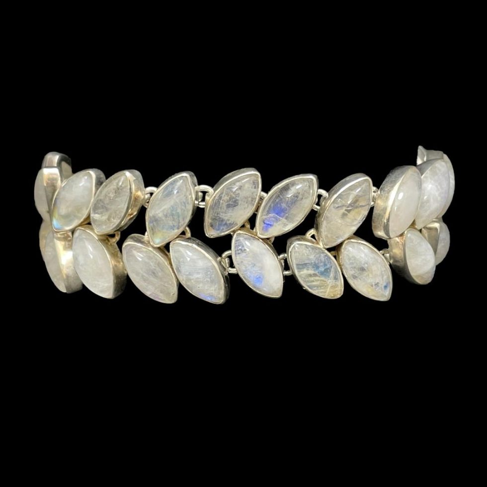Vintage bracelet set with rainbow moonstones. Sterling silver bracelet set with 27 stunning eye shaped rainbow moonstones. The stones are of high quality that flash colours in different shades of vibrant blues with hints of yellow and green. Slightly adjustable from 155mm to 195mm long. 25mm wide. Hallmarked 925 for sterling silver.