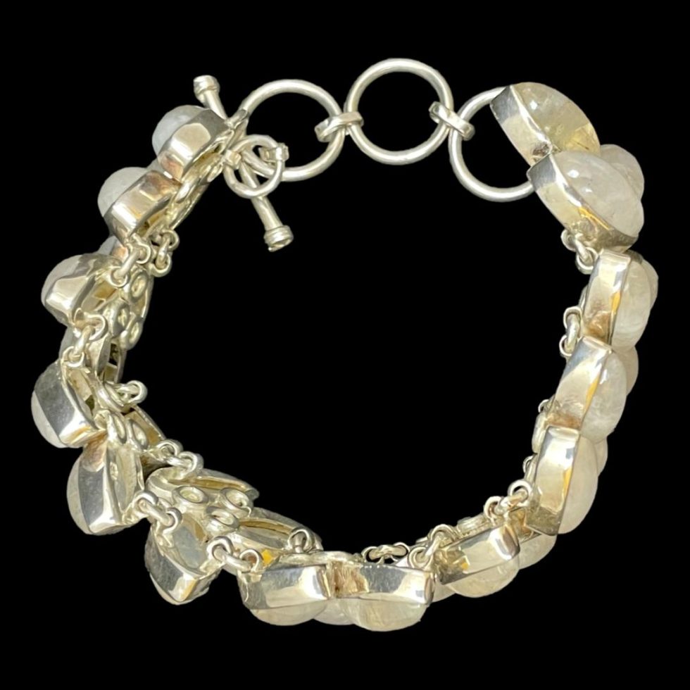 The vintage rainbow moonstone bracelet is sterling silver and features a series of oval moonstones along a silver link chain.