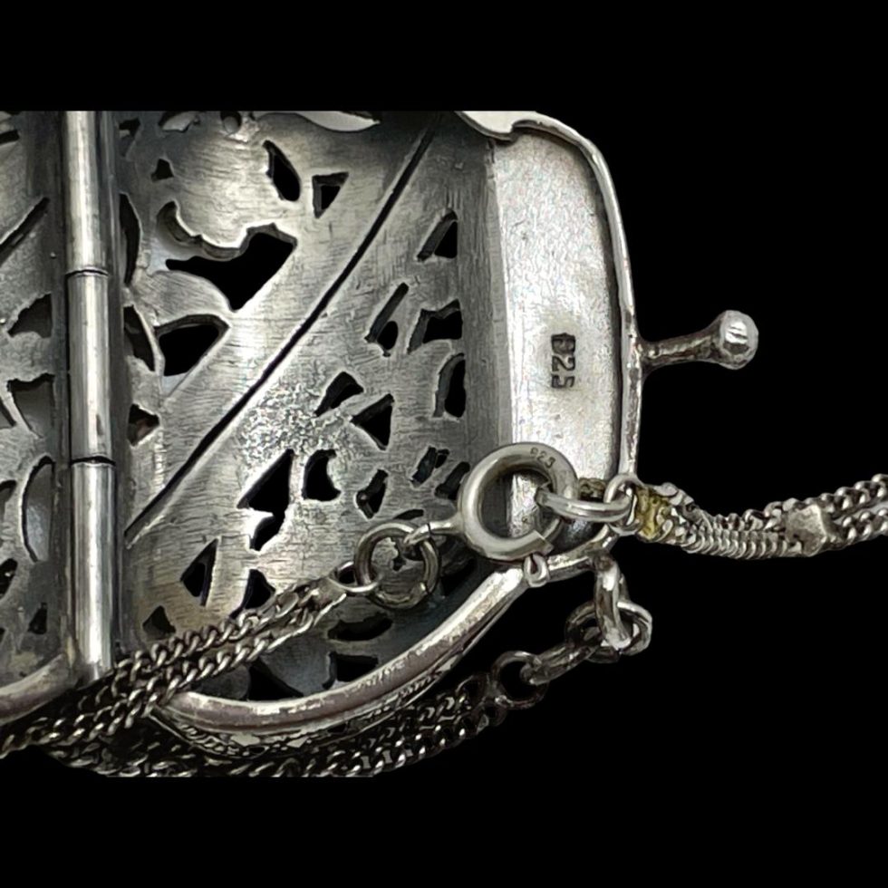 Vintage sterling silver purse pendant on attached silver chain. Lovely vintage purse pendant decorated with marcasite flowers opens up for adding scented cotton or emergency cash! On a nice long unusual sterling silver chain. 925 hallmark to inside of purse and chain clasp. The purse pendant measures 35mm long 16mm wide and 32mm at tallest. Chain measures 630mm.