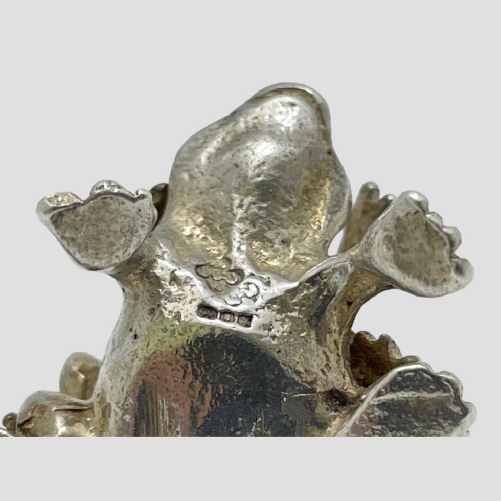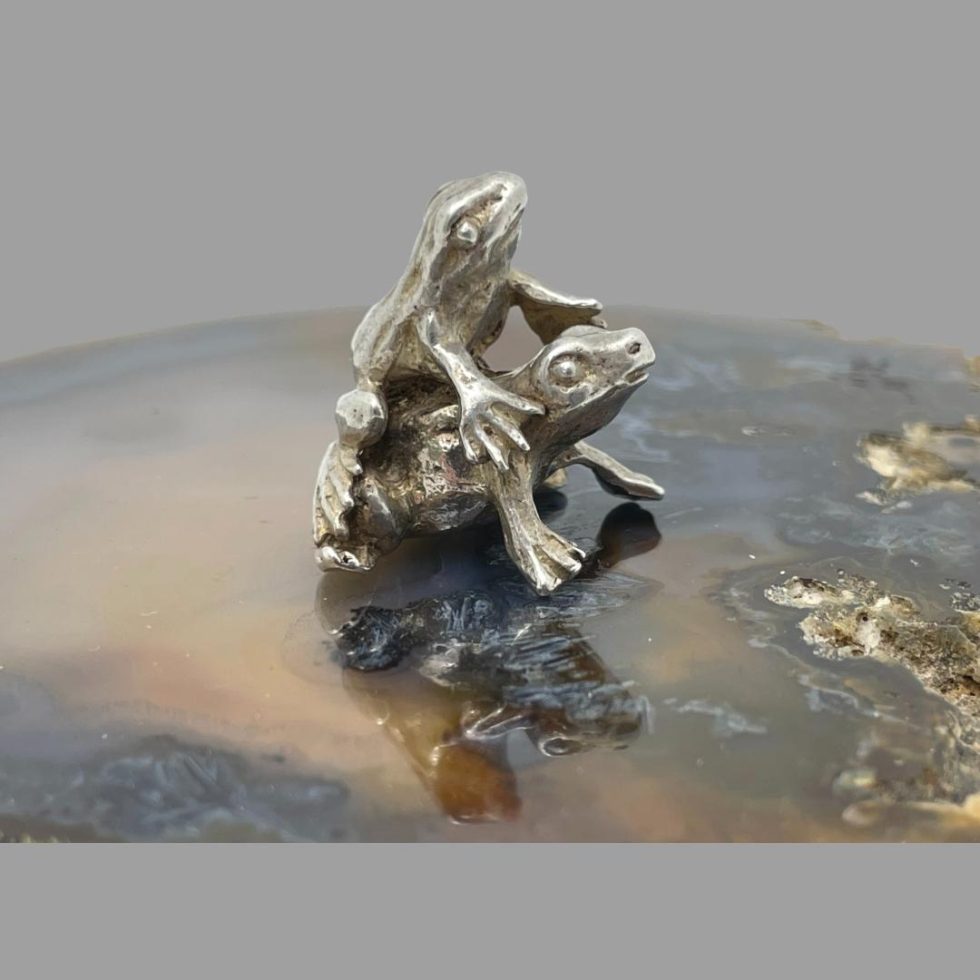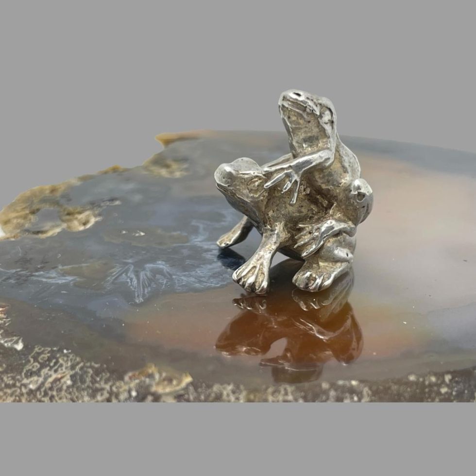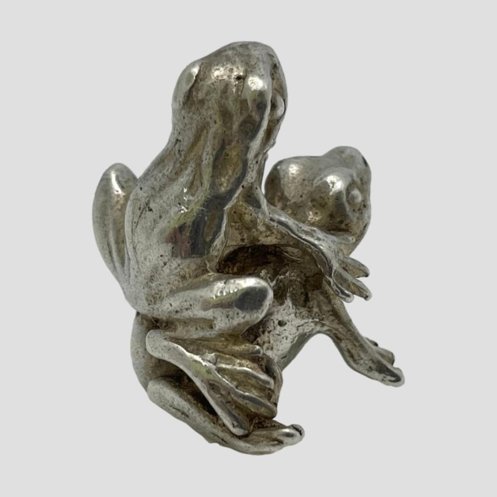 Vintage sterling silver miniature frogs. A sweet figurine of 2 frogs with one on top of the other. Lovely attention to detail in a minimalist way! Hallmarked for London assay c1984 and made by St James’ House. Measures approximately 20mm long, 22mm wide and 24mm tall.
