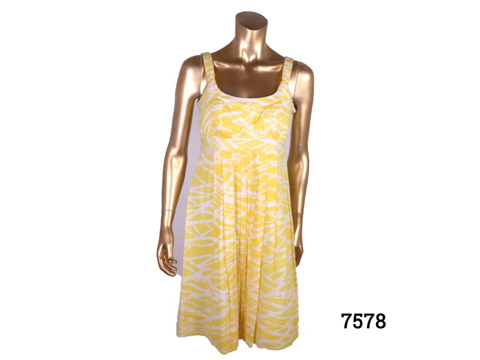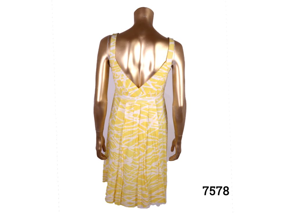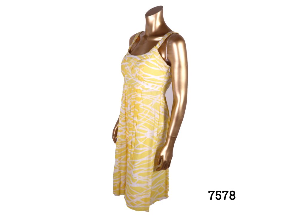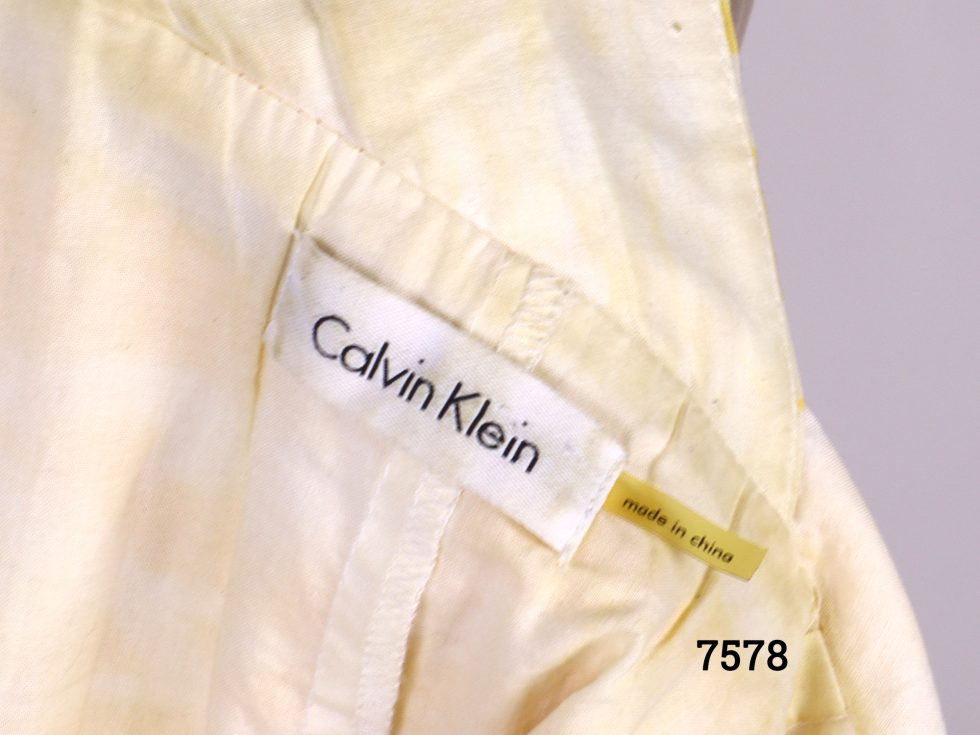 The summery Calvin Klein strap dress is in a size 10 UK and features a yellow abstract pattern in cotton with a plunge back and shoulder straps. The delightful summery Calvin Klein strap dress is in good order and would require dry cleaning to keep it in its current condition for longer.