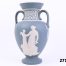 The vintage urn vase is in the style of a Geschutzt Greek vase that features heavenly figures decorating the whole body in blue and white. The attractive vintage urn vase would look well in most locations of the home and would require only light dust with a soft cloth to keep it in good condition.