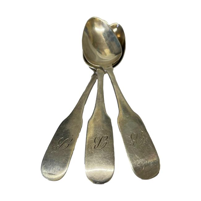 The 3 antique Irish silver teaspoons have a Dublin hallmark for c1805-1806 with the maker mark JD.